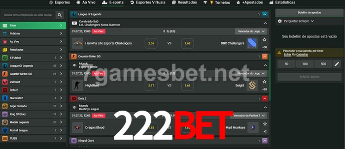 O 222Bet oferece uma grande seleção de opções de apostas em e-sports com probabilidades competitivas